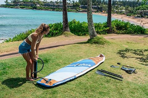 Remove the valve cap and ensure the valve pin is in the “up” position. Then connect the pump hose to the valve and the inflatable pump. Watch the barometer while pumping. Before you are at 7 PSI, the pumping efficiency can be improved through the double action mode. After 7 PSI, you should switch to use the single action mode and observe the barometer, then stop pumping when the pressure of the sup board reaches the standard pressure.